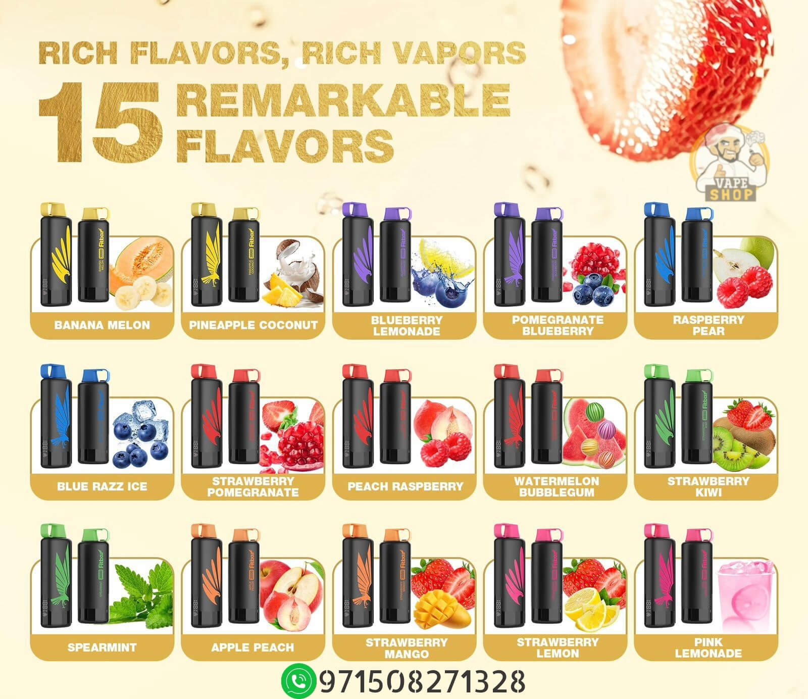 It comes in 15 flavors including Apple Peach, Banana Melon, Blue Razz Ice, and more.